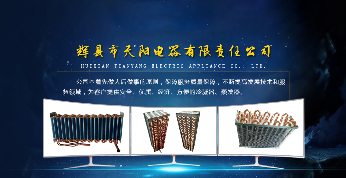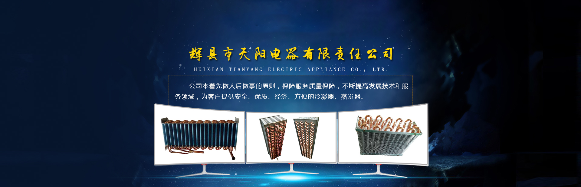 輝縣天陽電器有限責(zé)任公司位于肥沃的中原河南省輝縣市學(xué)院路中段工業(yè)集聚區(qū)興業(yè)園3號(hào)廠房,以制冷設(shè)備用冷凝器,蒸發(fā)器,熱交換器為主。主要材料為銅管鋁翅片,銅管銅翅片,鋁管鋁翅片。廣泛應(yīng)用于冰箱冰柜,制冷設(shè)備,暖通設(shè)備,空調(diào),自動(dòng)售貨機(jī),冷干機(jī),超市立風(fēng)柜,冷藏車,烘干機(jī)等產(chǎn)品領(lǐng)域。  公司自1998年成立以來,始終堅(jiān)持:“科技造就產(chǎn)業(yè)、質(zhì)量成就信譽(yù)、誠信鑄就輝煌”的質(zhì)量方針,從產(chǎn)品拓展上堅(jiān)持“人無我有,人有我優(yōu),人優(yōu)我特的”經(jīng)營理念,25年來,從1998年開始供應(yīng)河南冰熊集團(tuán)下屬的冷柜廠,制冰機(jī)廠各種冷凝器;2003年之后,原冰熊集團(tuán)的精英志士開始在全國各地發(fā)展,所到之處依托我公司供貨,以致于多家目前已具行業(yè)中佼佼者的公司,從而建立了如凱雪公司,兆邦公司、凌云公司、海寶公司、正雪公司、上海忠云、山東德萊維等幾十余家公司在草創(chuàng)時(shí)期的啟蒙供貨商,友好共贏長達(dá)十余年,成為我國制冷行業(yè)的供應(yīng)商。以致在2015年初雙匯集團(tuán)面向社會(huì)的招標(biāo)書中指名要我公司冷凝器、蒸發(fā)器指定產(chǎn)品供應(yīng)商